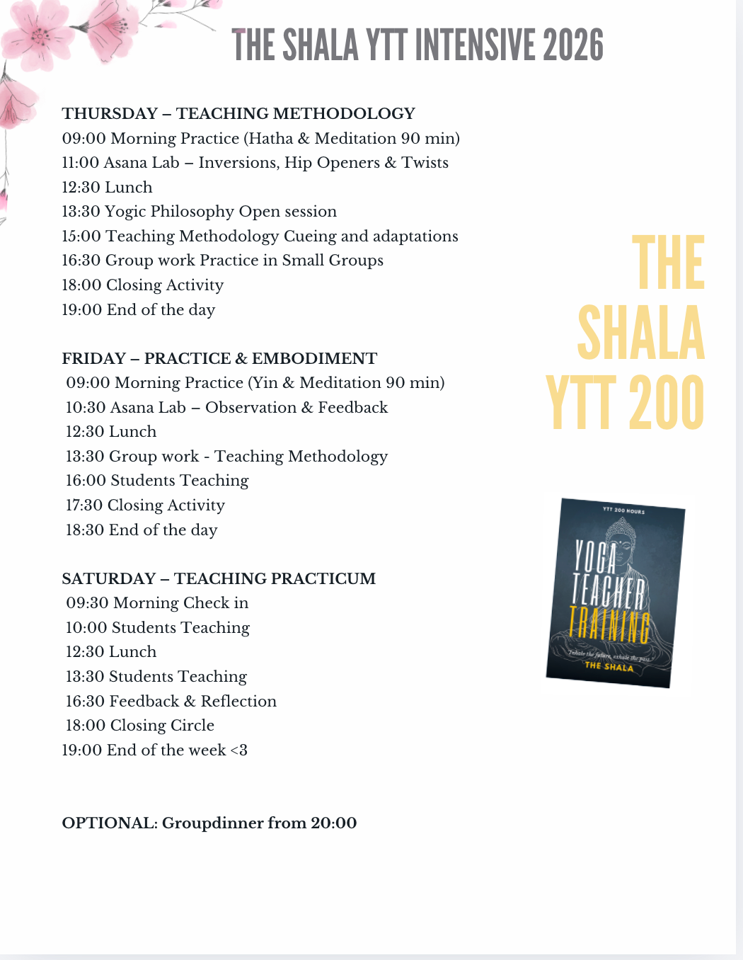 Vi møtes en hel uke for på The Shala på Fornebu for et tettpakket program med undervisning og praktisering. Du vil få mye påfyll i løpet av denne uken, med masse praksis og undervisning. Du vil bli godt kjent med de andre i gruppen og knytte nye vennskap!